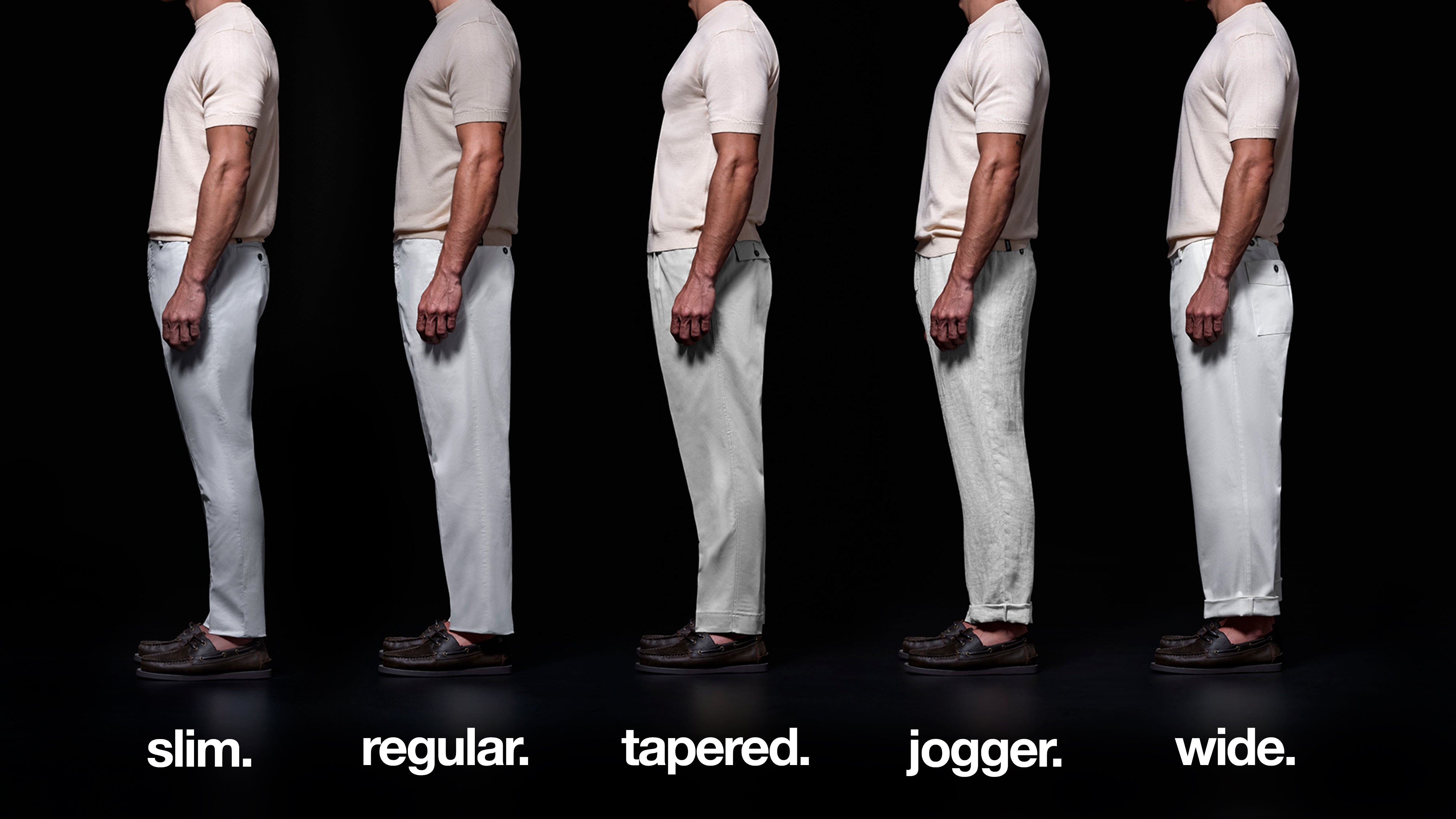 For those looking for a balance between structure and modernity, Tapered Fit pants are the ideal choice. The fit is more relaxed through the thigh and knee and narrows towards the hem, creating a clean, contemporary silhouette. An alternative to classic chinos, designed for a refined yet effortless look.